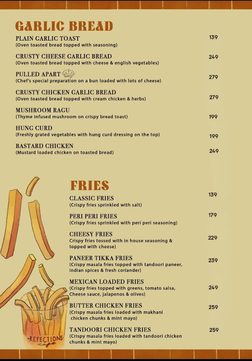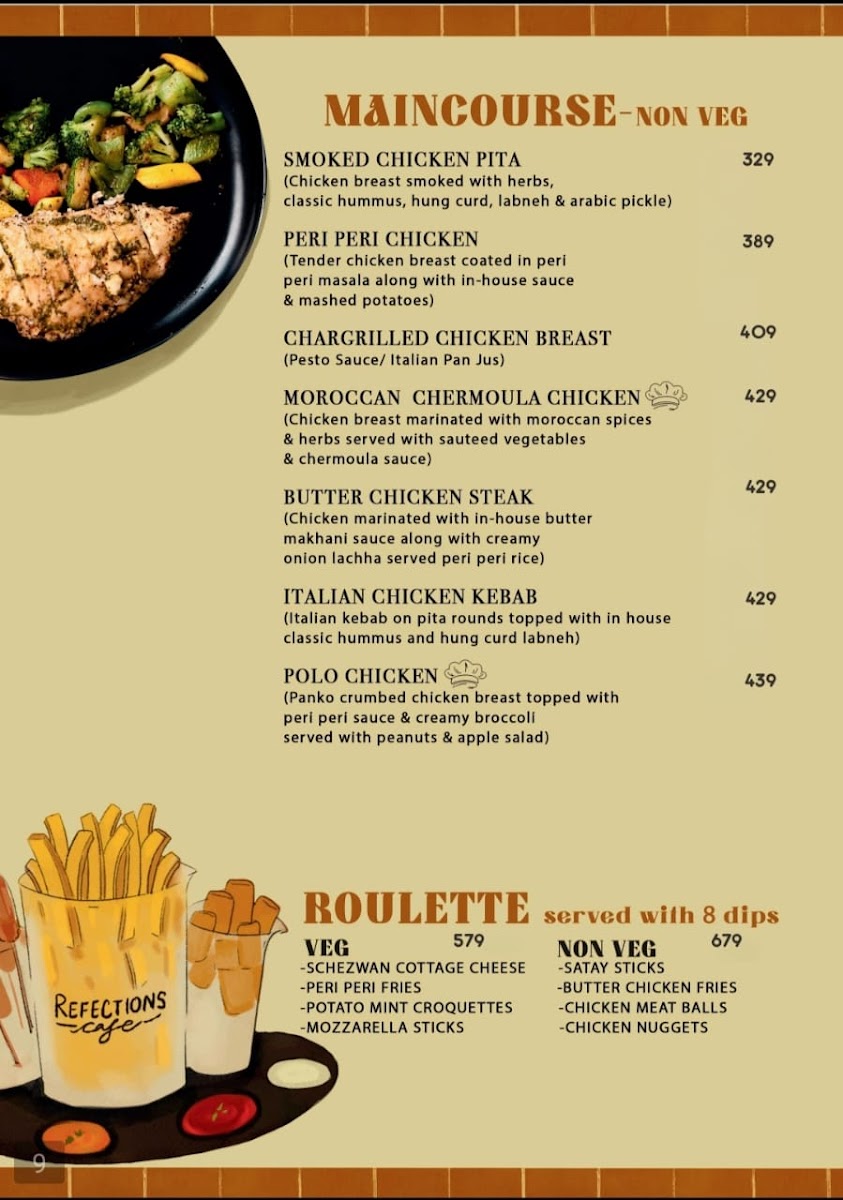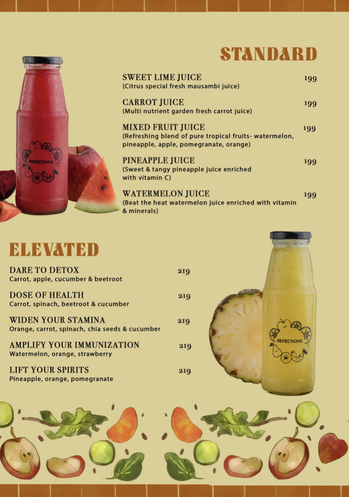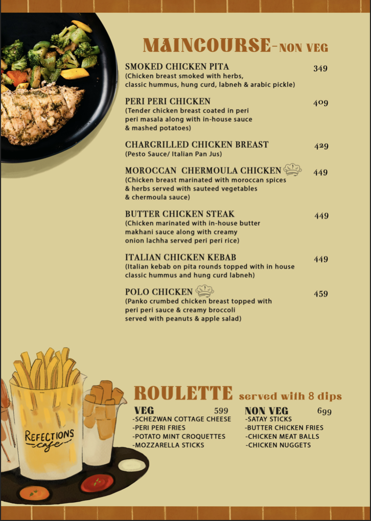 The menu at Refections Cafe offers a variety of options suitable for different times of the day, including breakfast, light meals, and beverage breaks. It is organized into groups that cover fresh juices, omelettes, snacks, main courses, and beverages, allowing visitors to choose from a diverse selection.