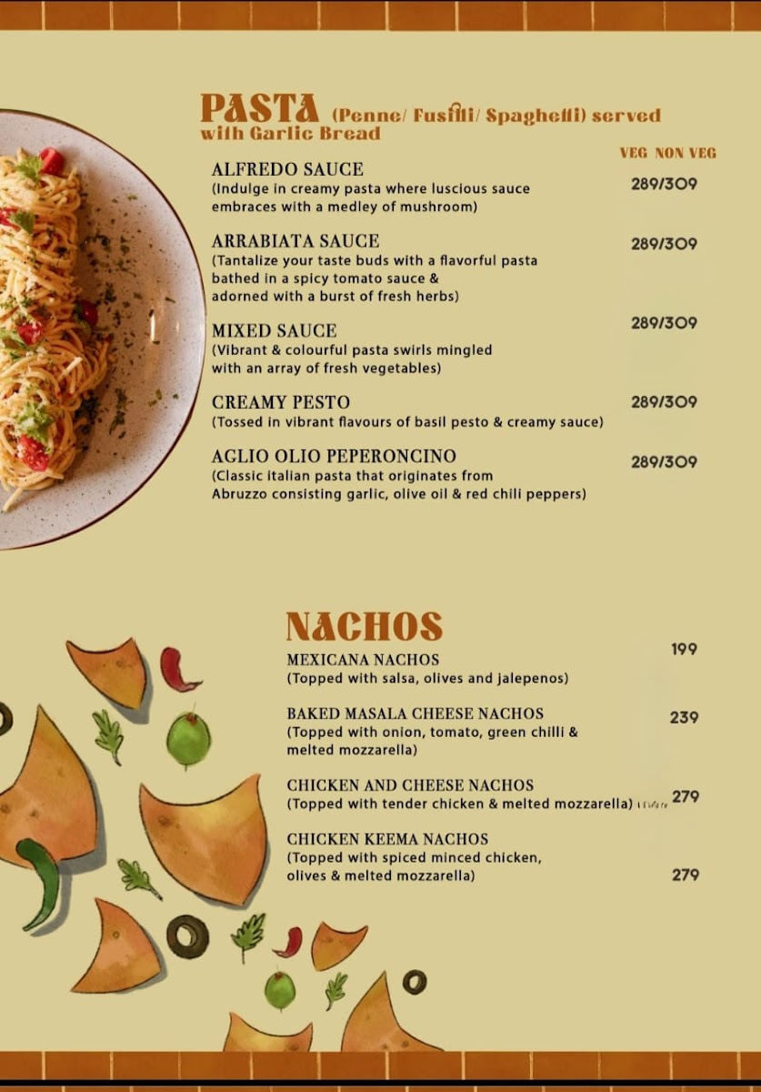 Snacks and Light Bites: The menu includes finger foods like chicken and vegetable strips, barbeque chicken wings, chicken and paneer momos, Mexican nachos in various styles, and veg Schezwan sizzler. These items are suited for quick orders or casual snacking.