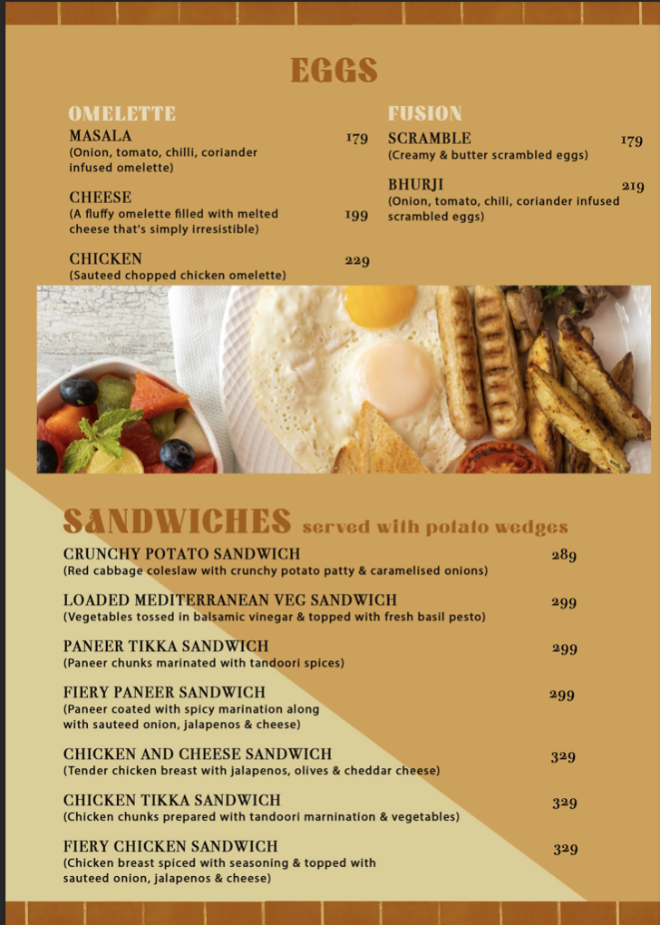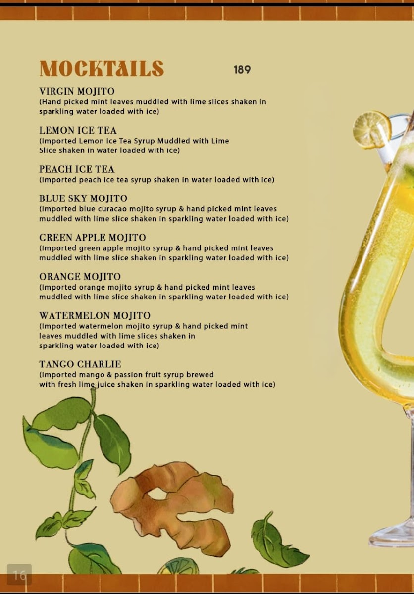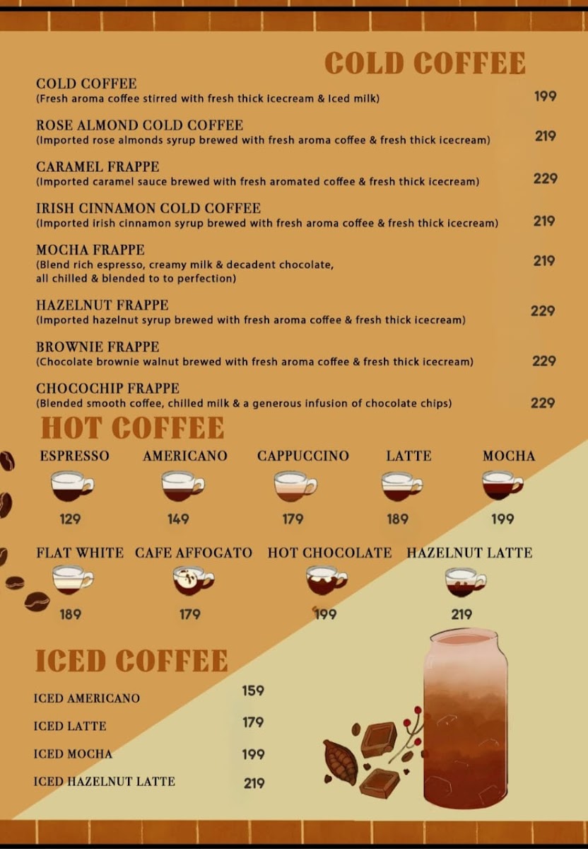 Beverages: Alongside fresh juices, iced coffees including Americano, latte, mocha, and hazelnut latte are offered. Mocktails and other non-alcoholic drinks complement the menu selections.